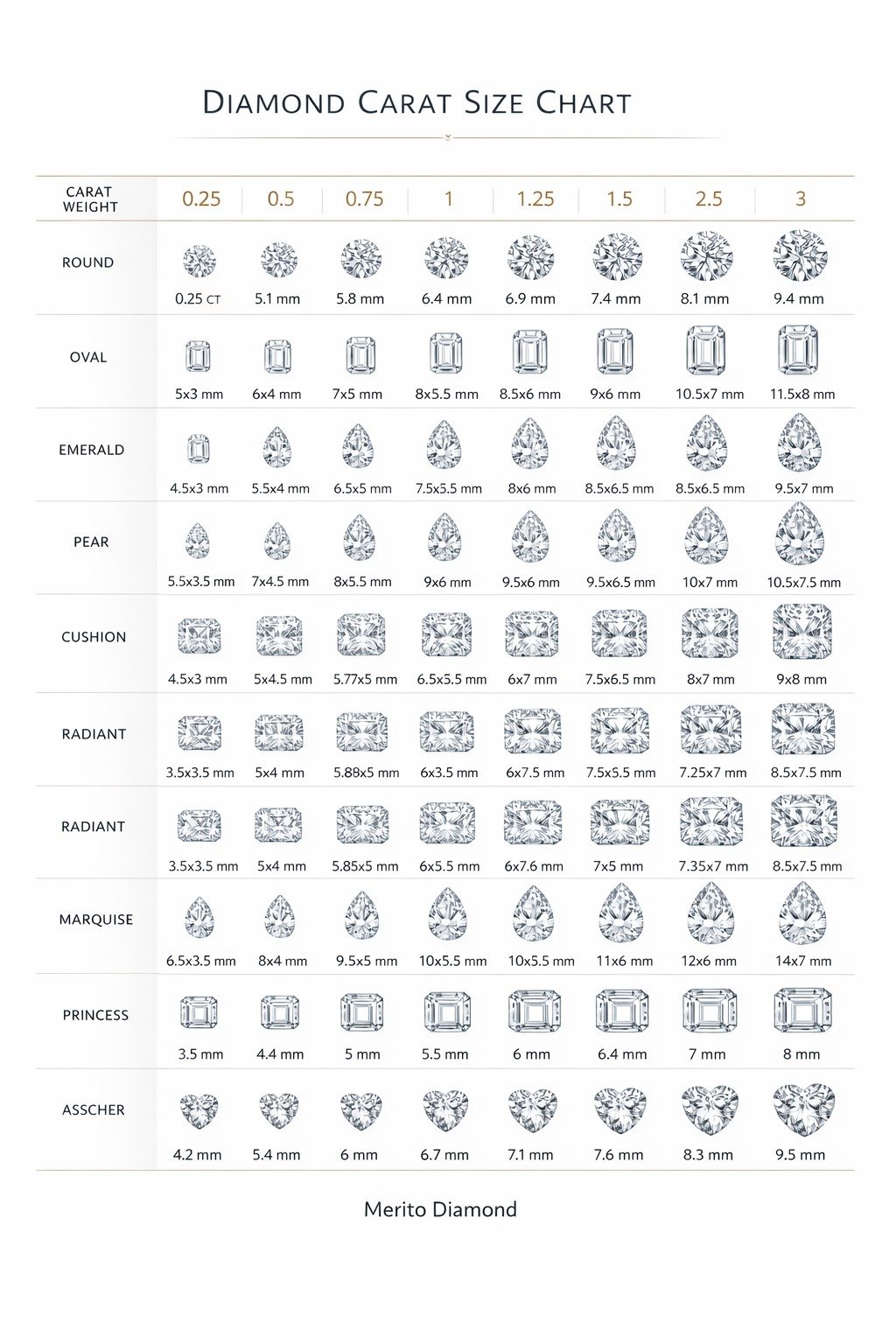 Use this chart as a simple guide when comparing diamond sizes and choosing the right stone for your ring or jewelry. Since every diamond is unique, the actual appearance may vary slightly.