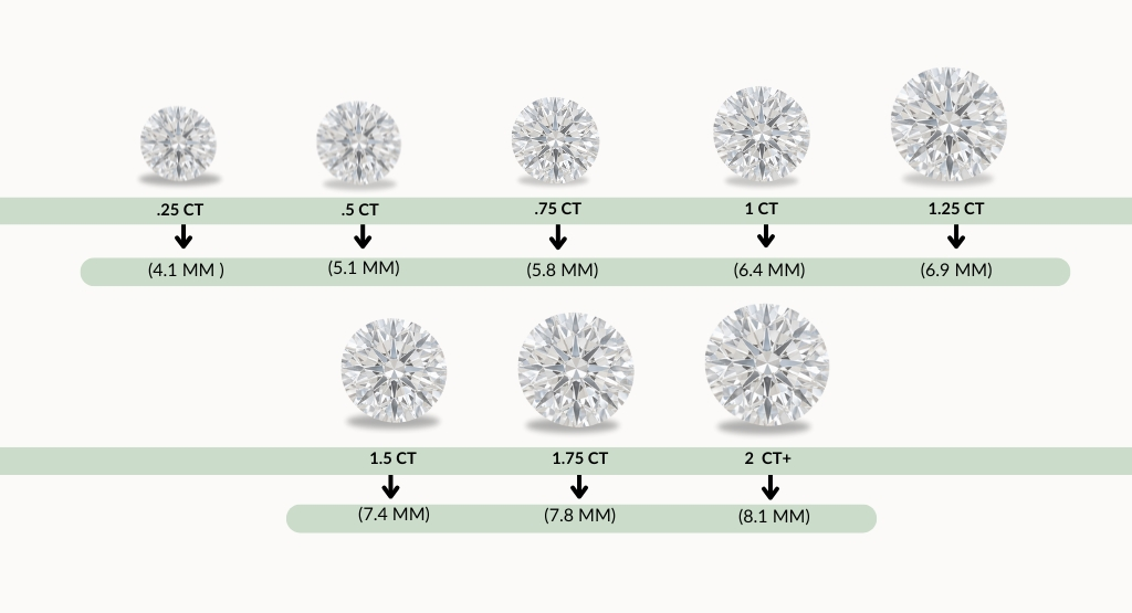 A one-carat round diamond typically measures around 6.4 mm in width, but this can vary. Other shapes may look larger or smaller even at the same carat weight.