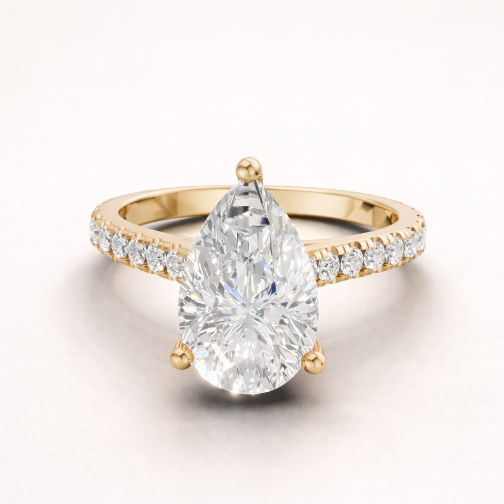 Pear shape diamonds, also called teardrop diamonds, feature a unique blend of round and marquise cuts. Their elegant tapered point creates a graceful silhouette that flatters the finger and adds a distinctive touch to any ring design. Pear diamonds are popular for engagement rings because of their romantic and eye-catching style.