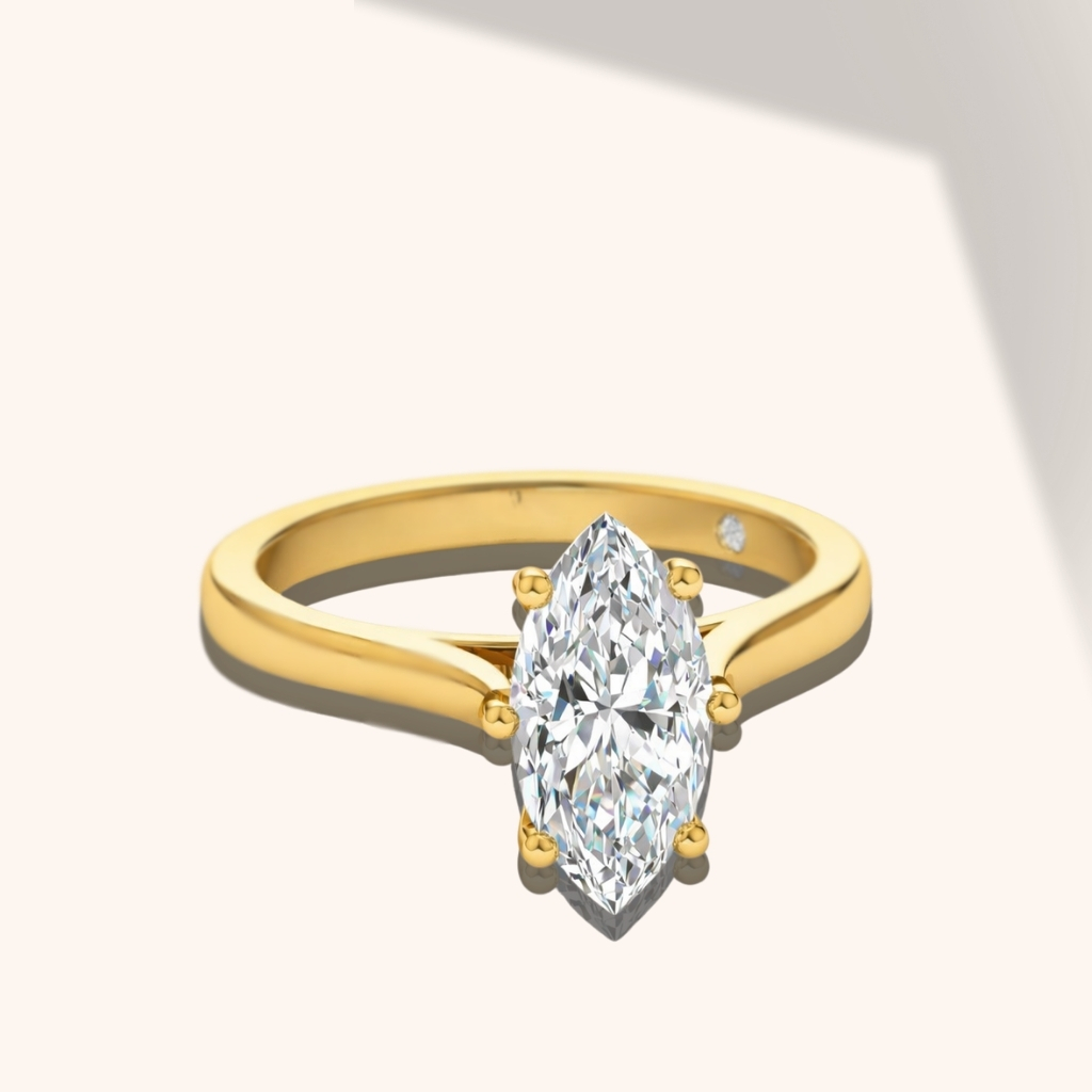 Marquise shape diamonds are known for their long, narrow outline and pointed ends, creating a bold and elegant appearance. This elongated shape maximizes surface area, making the diamond look larger than many other cuts of the same carat weight. Marquise diamonds are also flattering on the hand, giving fingers a longer, slimmer look.