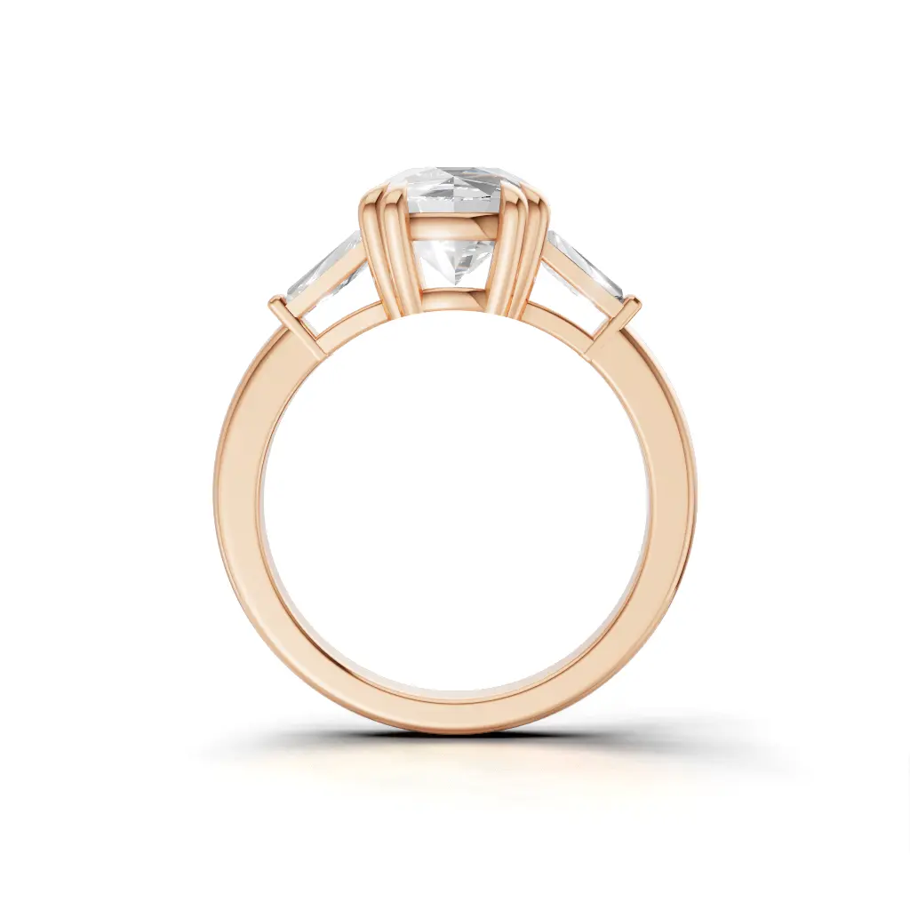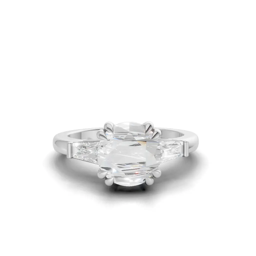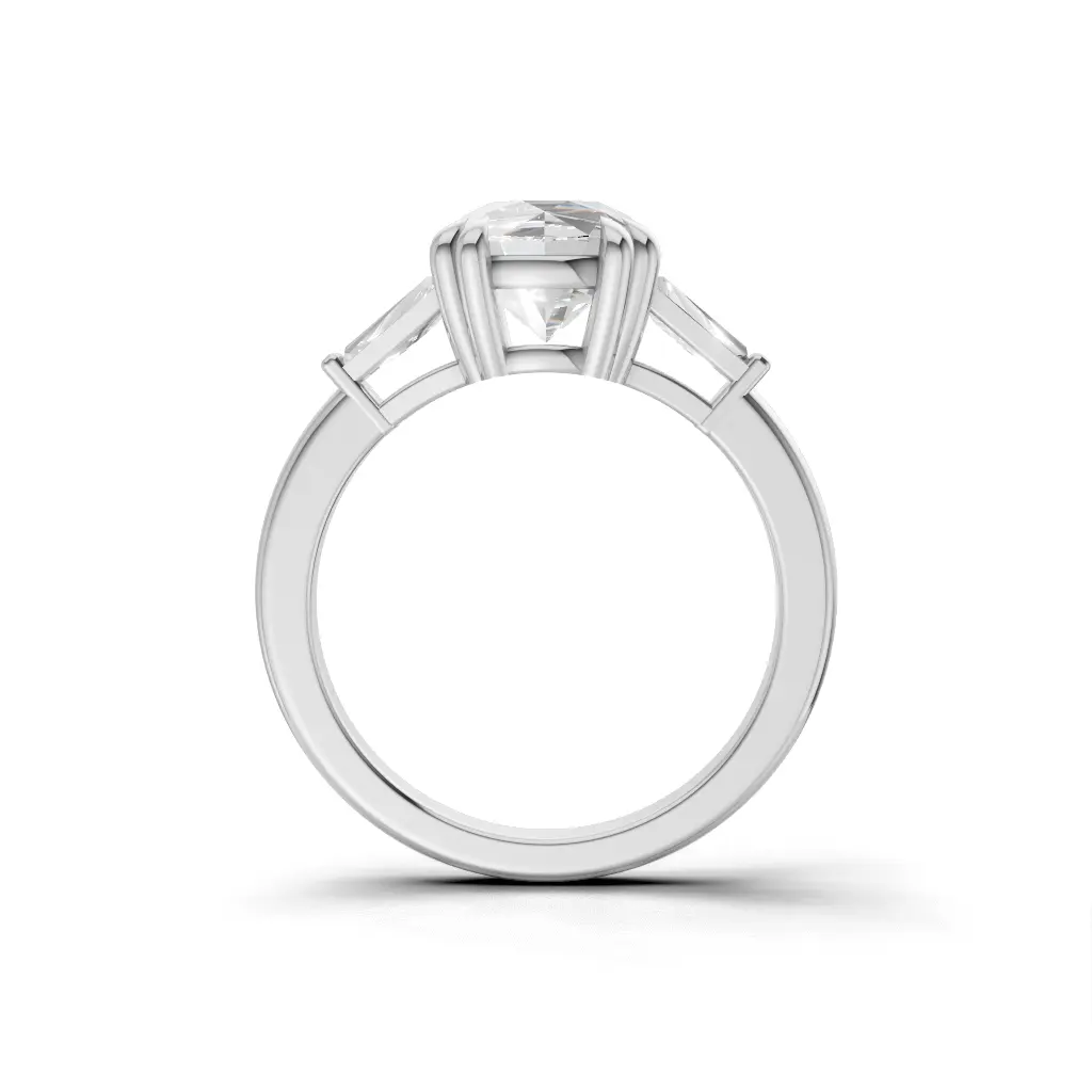 A strikingly unique center stone with angular, sculpted edges sits gracefully between two tapered side stones, creating a bold yet refined silhouette. On a woman’s hand, the ring adds a touch of artistic sparkle, its geometric shape enhancing the natural beauty and elegance of her fingers.”