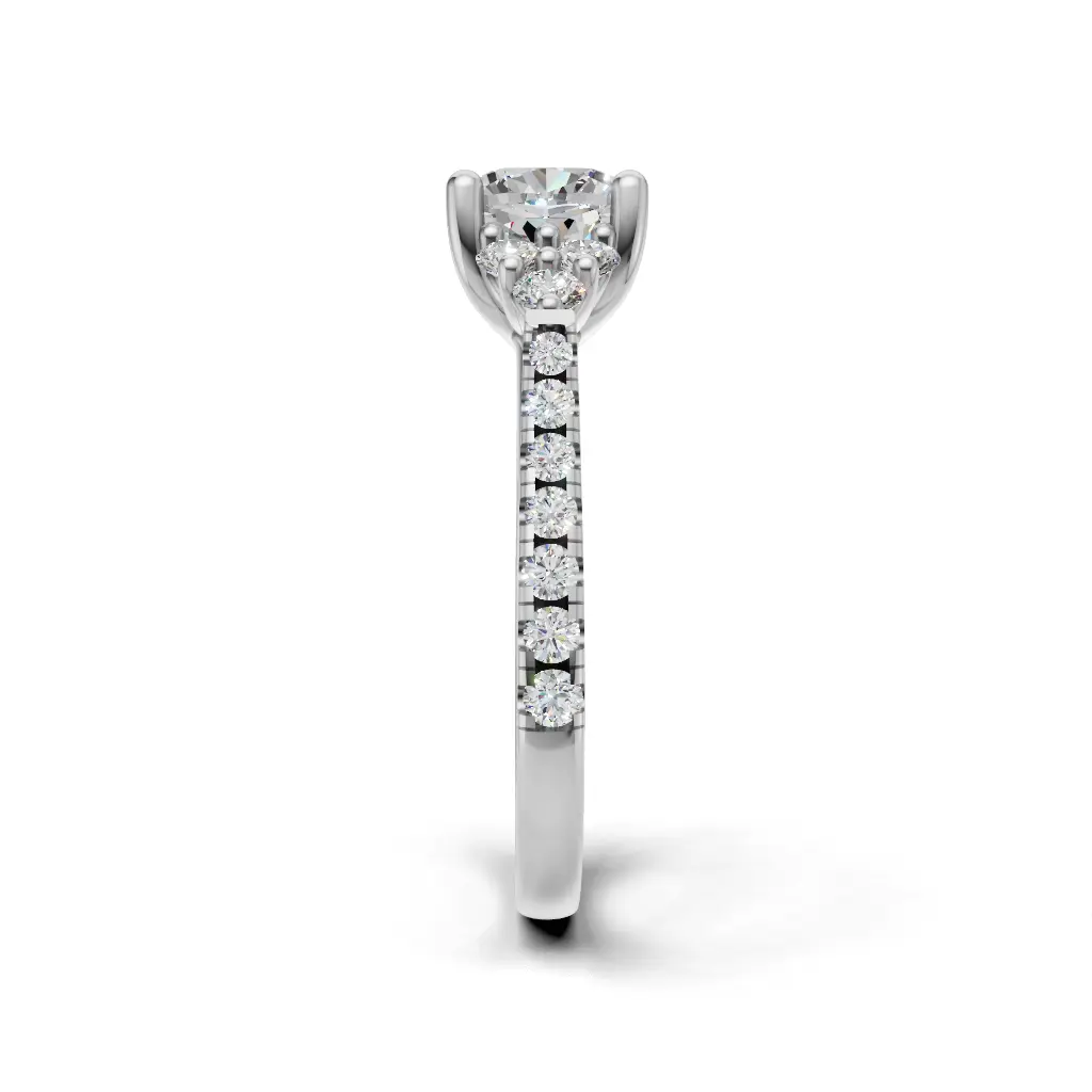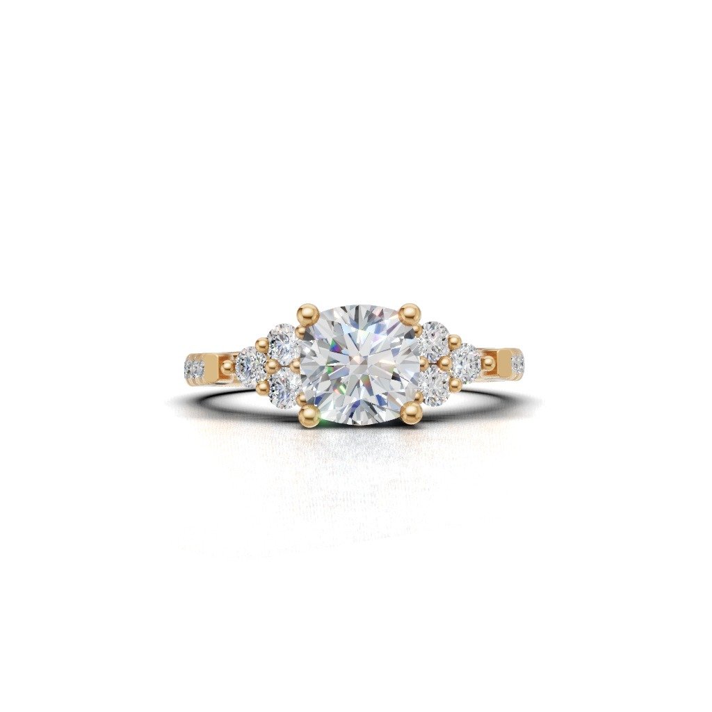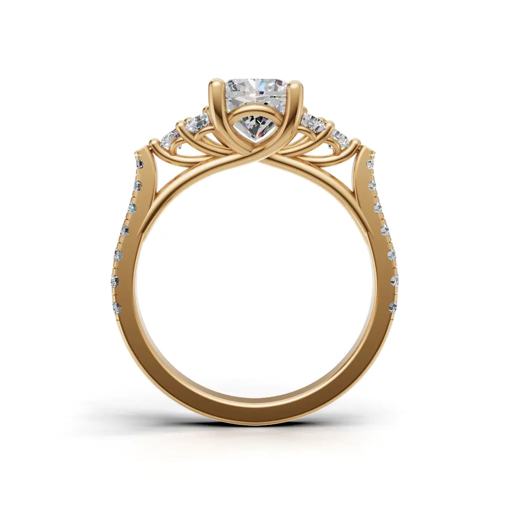 A luxurious gold ring featuring a diamond held in an intricate crown-style setting, accented with delicate side stones for a regal and timeless sparkle.”