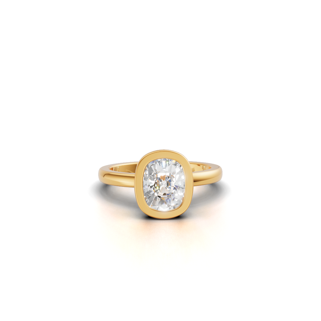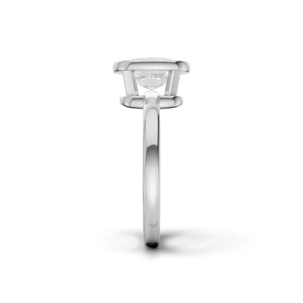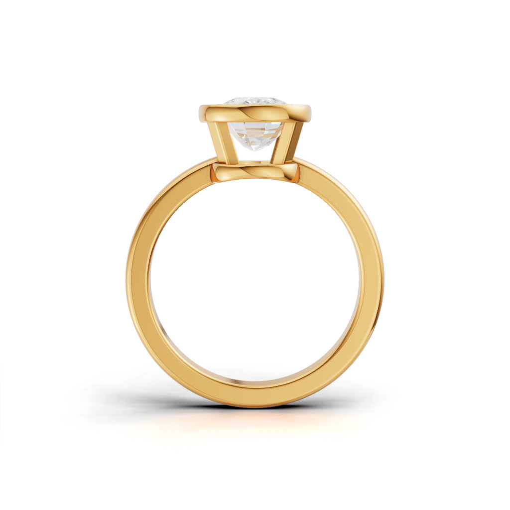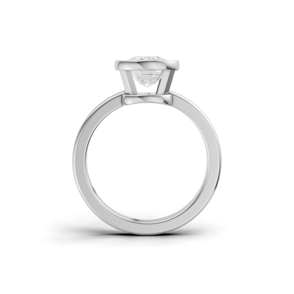 It Features a Round, Brilliant Diamond Completely Encircled By a Smooth, Polished Metal Rim. This Style Is Known For Its Contemporary, Minimalist Look And Offers Maximum Protection For The Center Stone. It’s a Chic And Highly Practical Choice.