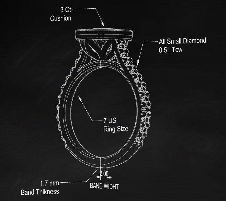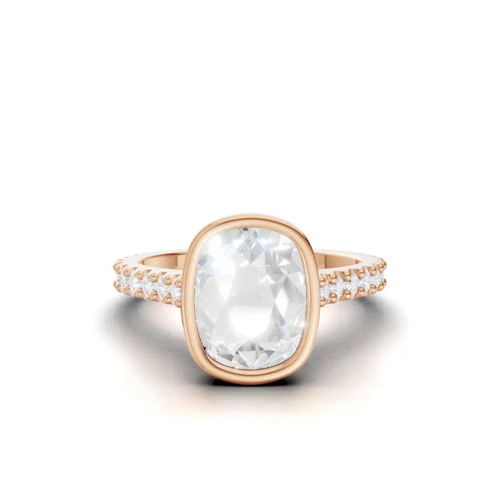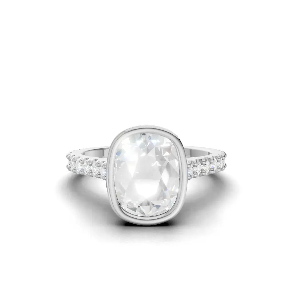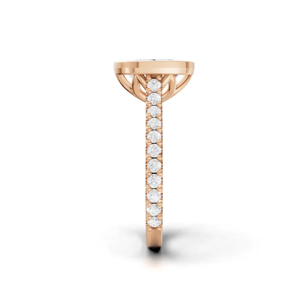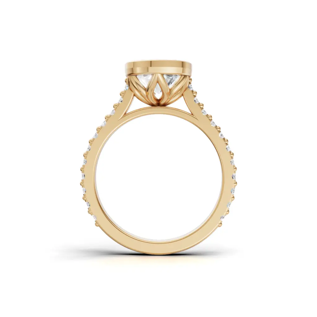 Flora bezel engagement ring features a regal design with a tall, graceful profile lined with sparkling stones, offering true queen’s elegance from every angle.