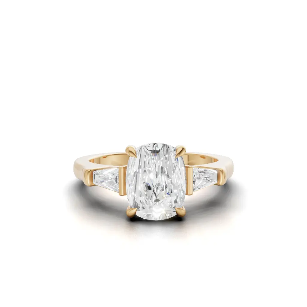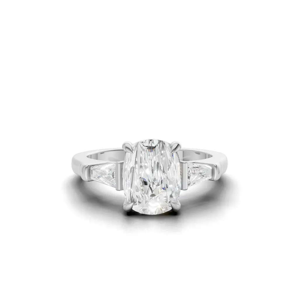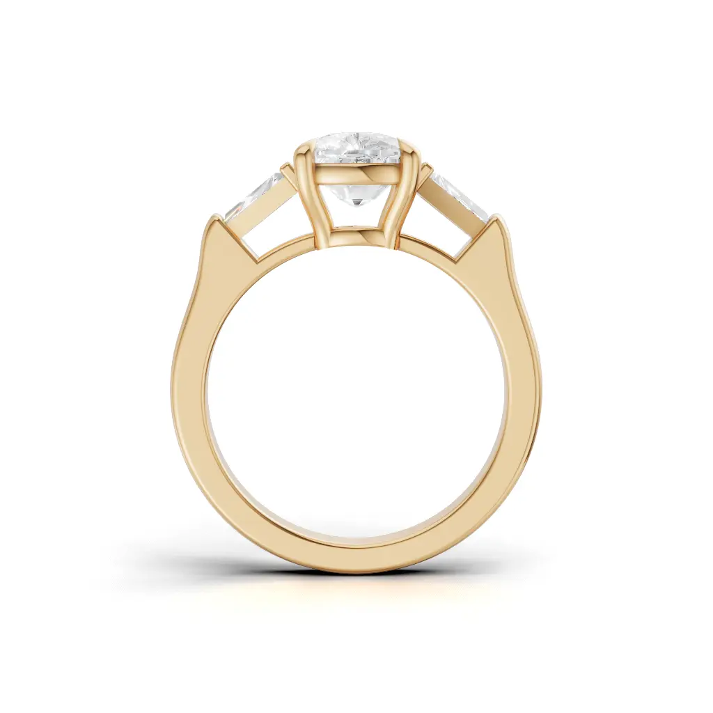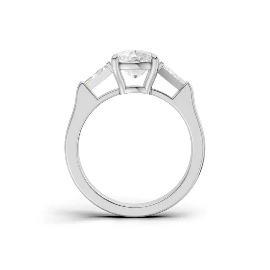 “A round, radiant center stone with sleek tapered sides creates a graceful shine that beautifully complements the natural elegance of a woman’s hand.”