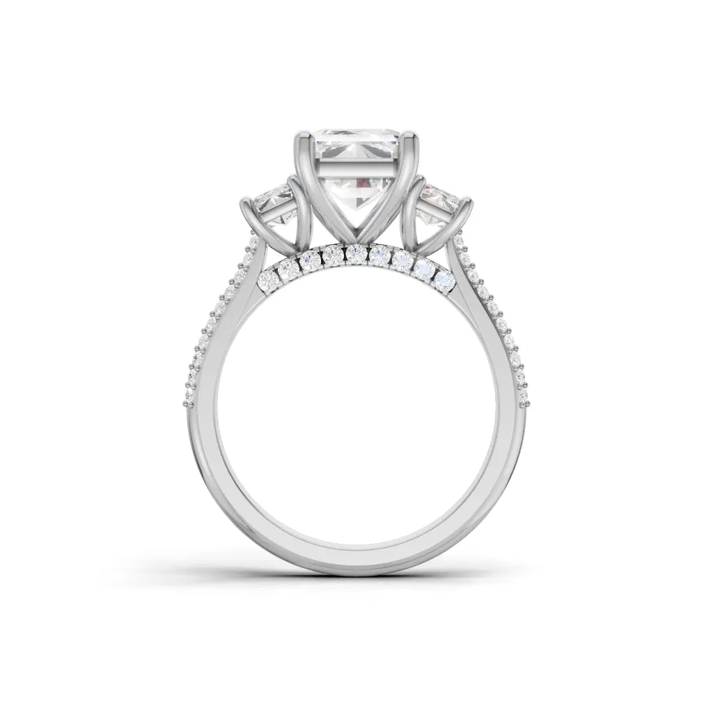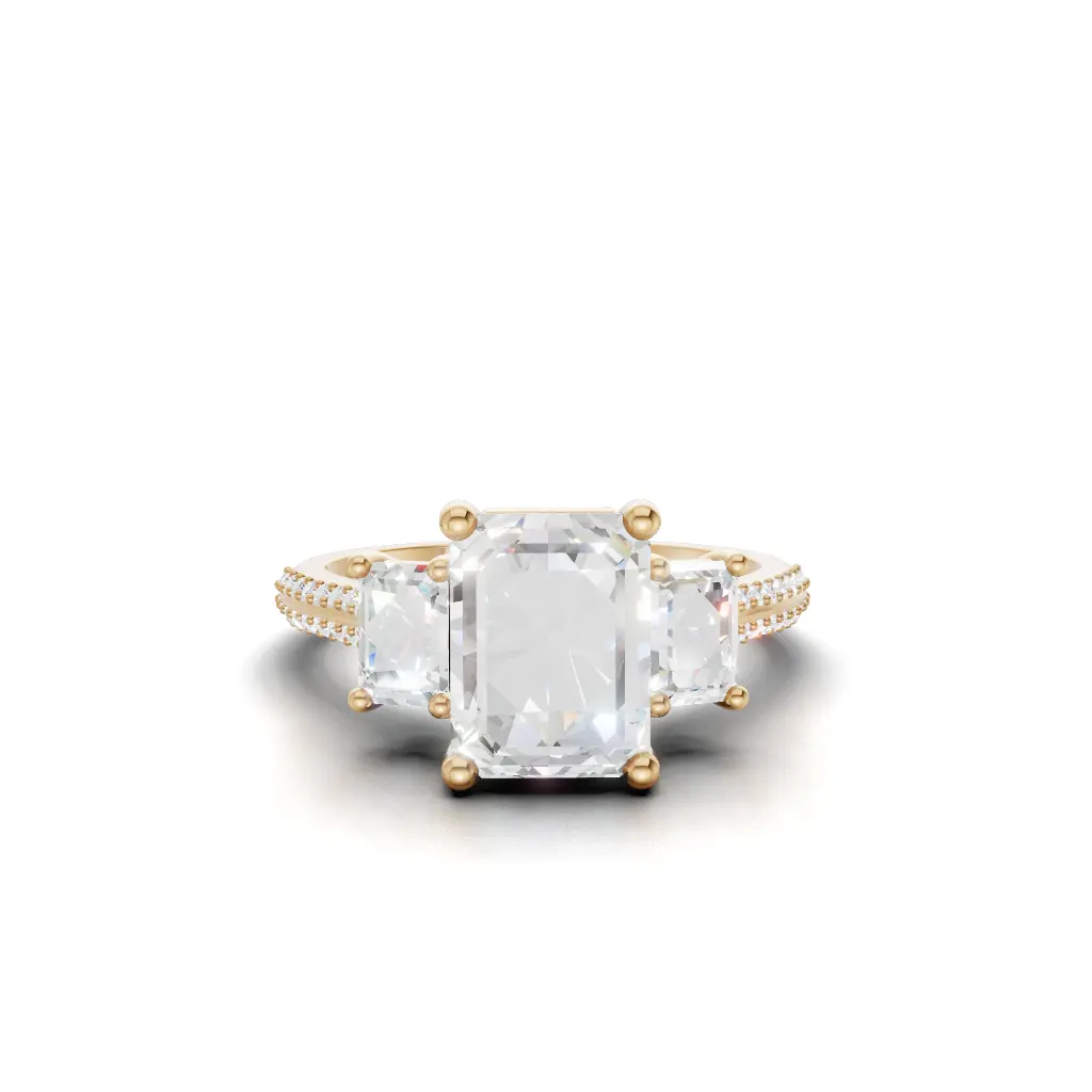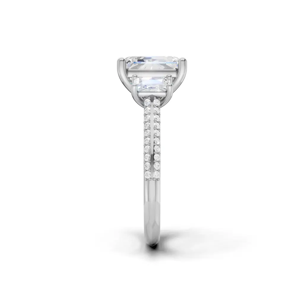 Celebrate enduring love with the Amor Prism Three-Stone Engagement Ring by Merito Diamond. Crafted in elegant gold, it features three sparkling stones symbolizing past, present, and future. A timeless, luxurious design perfect for a meaningful proposal.