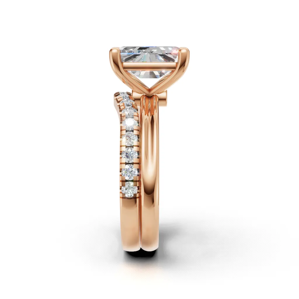 This elegant gold ring set features a perfectly flush fit, with the engagement ring and band sitting seamlessly together without any gap.