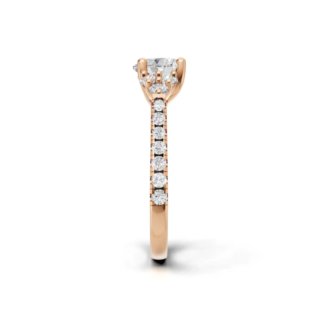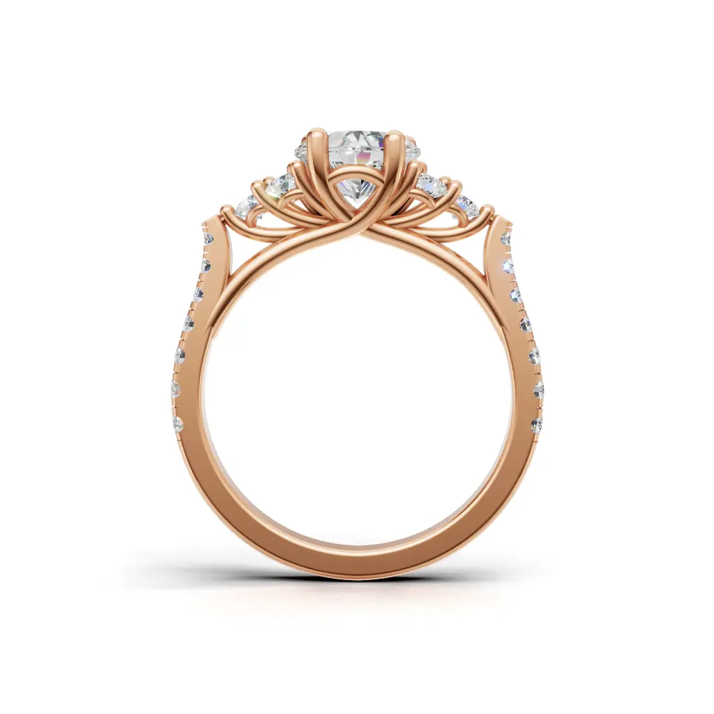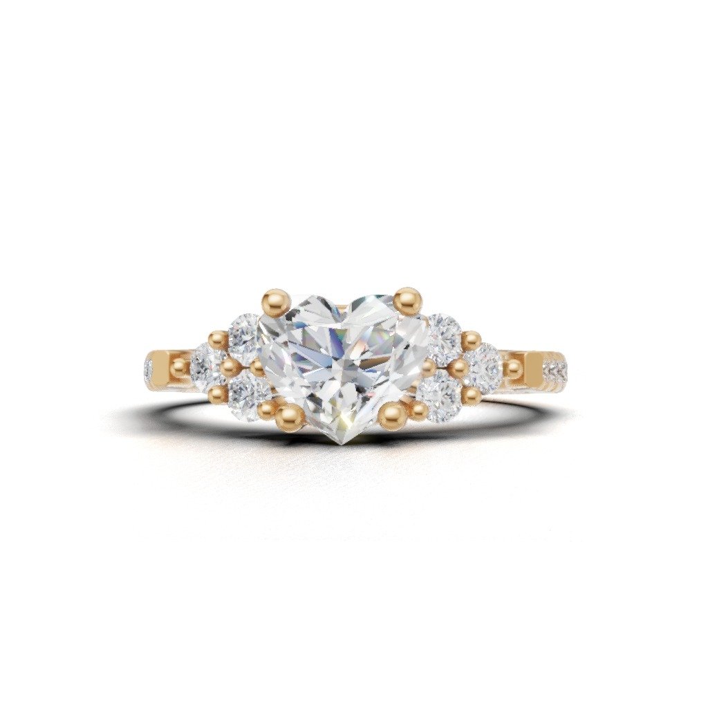 A luxurious gold ring featuring a diamond held in an intricate crown-style setting, accented with delicate side stones for a regal and timeless sparkle.”