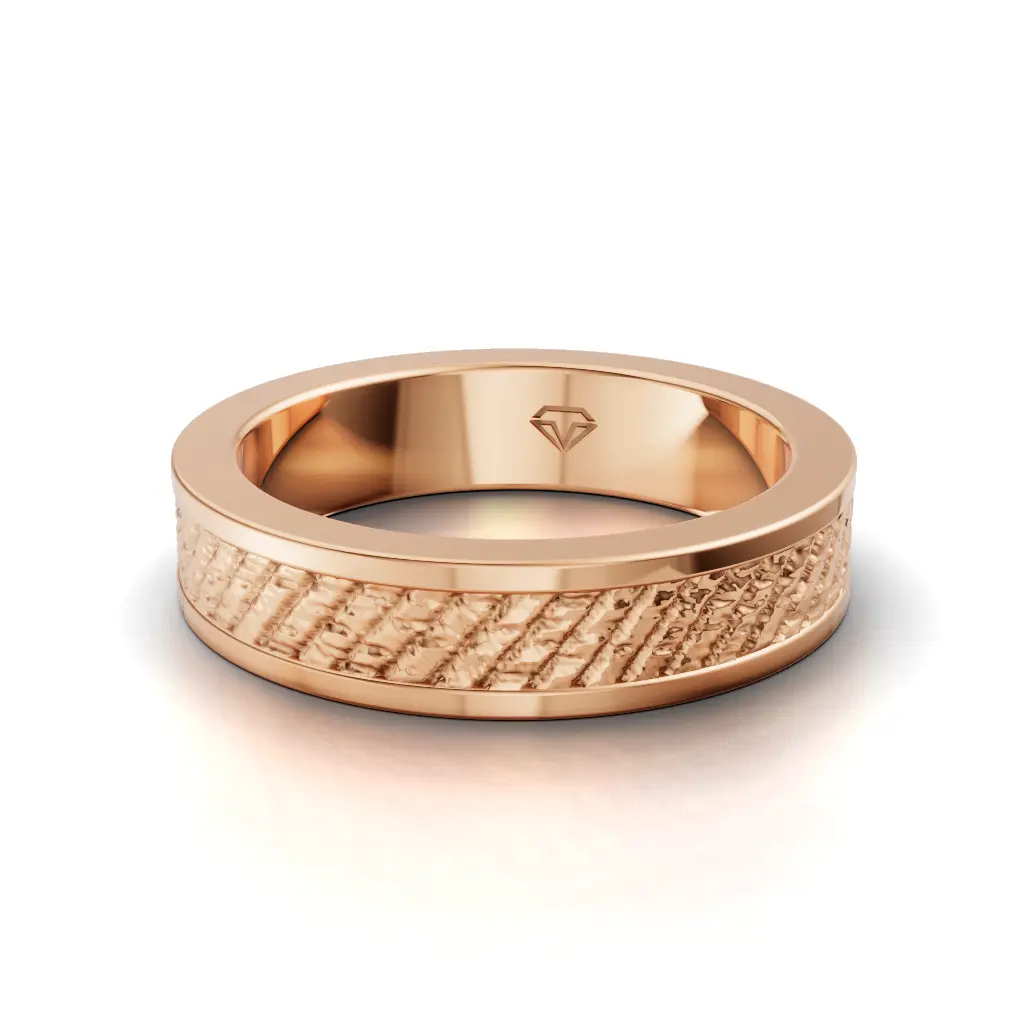 A rugged, textured gold band with a raw and bold character. Strong, masculine, and crafted to make a powerful statement.