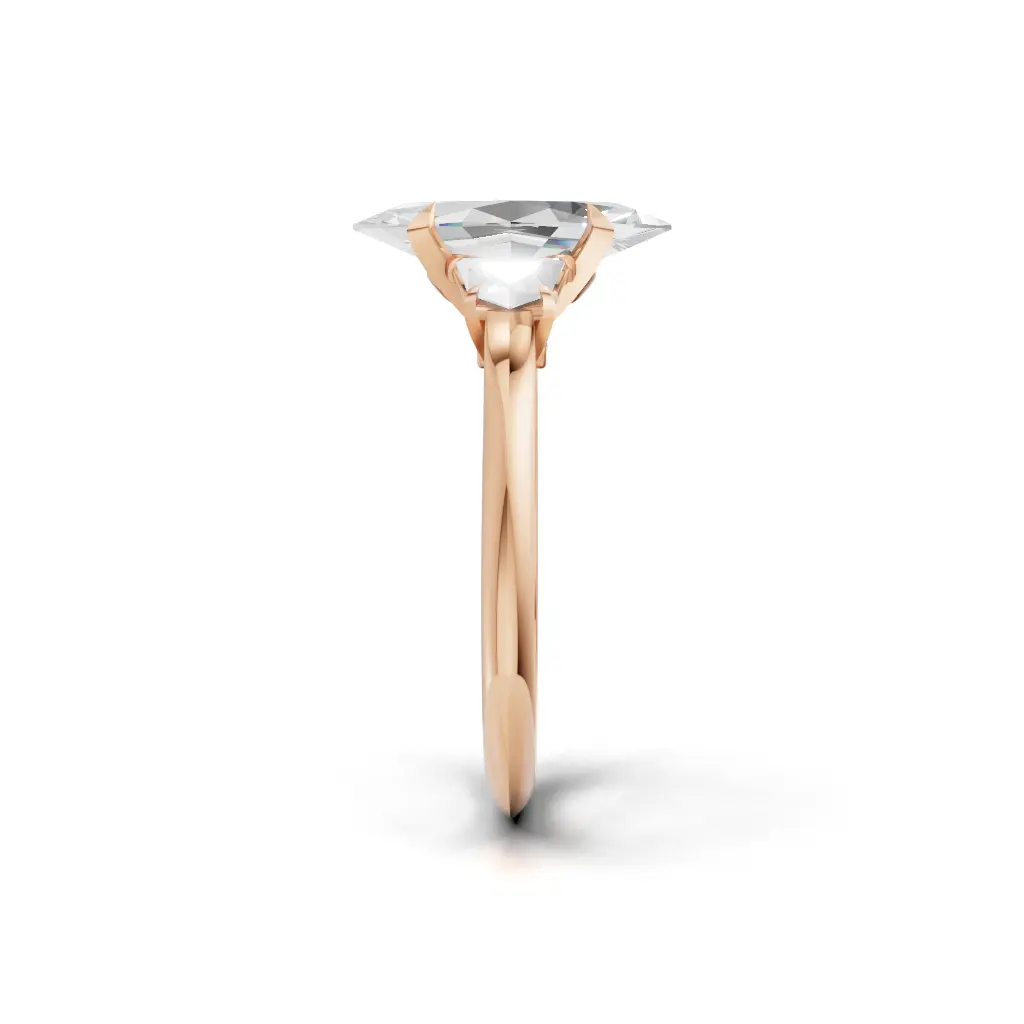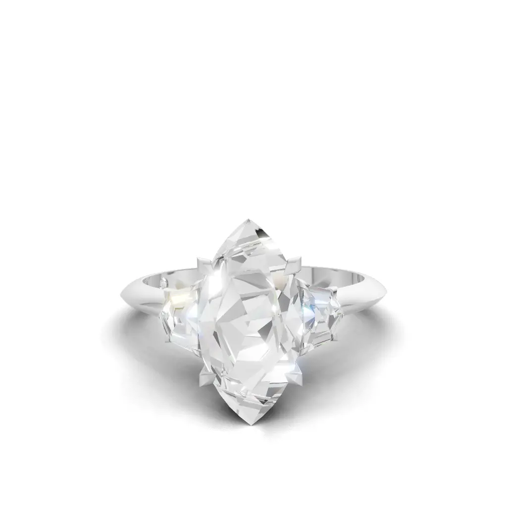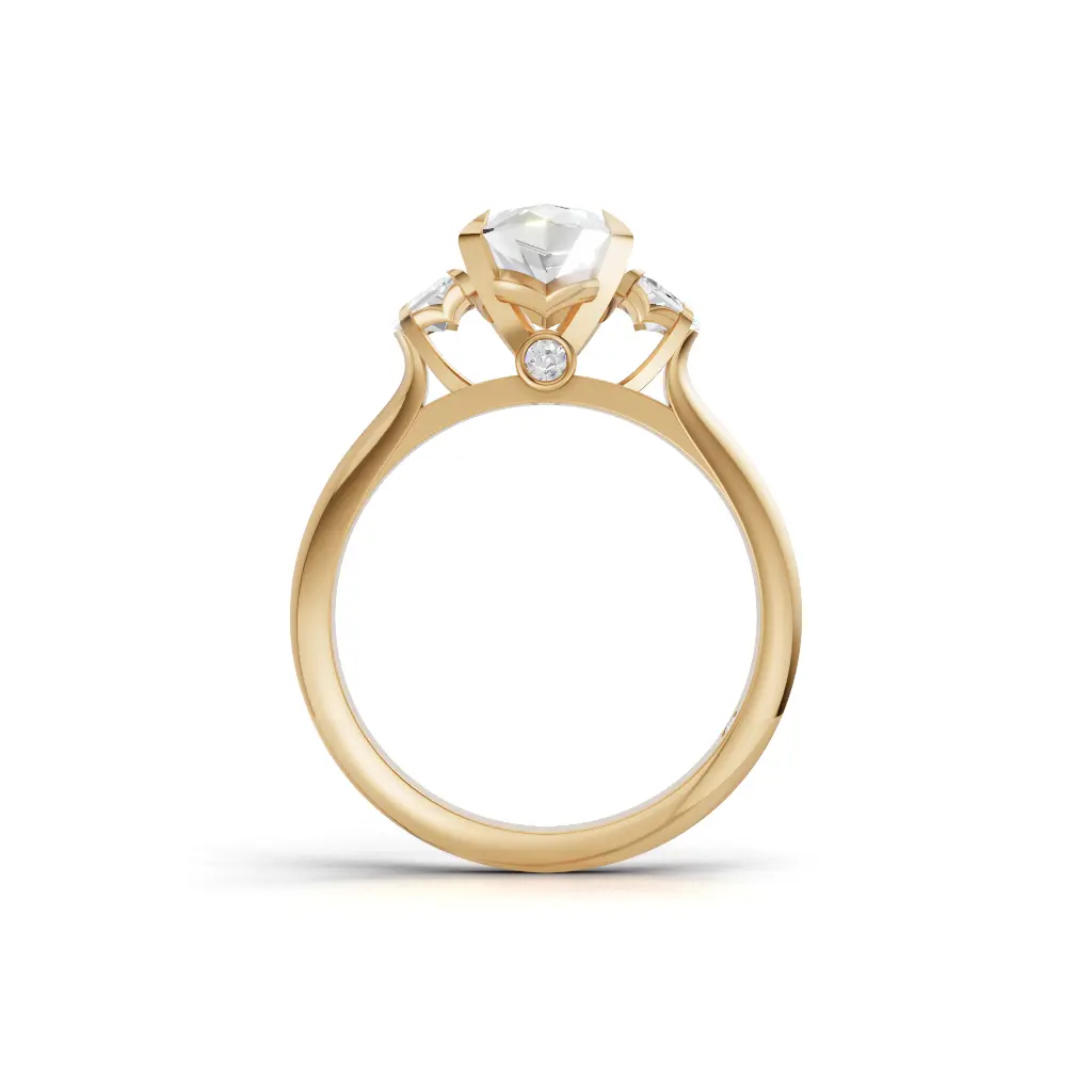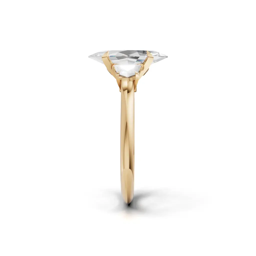 Celebrate everlasting love with the Dragonleaf Nova Three-Stone Engagement Ring by Merito Diamond. Crafted in elegant gold, it features three sparkling stones representing past, present, and future. A timeless, luxurious design perfect for a meaningful proposal.