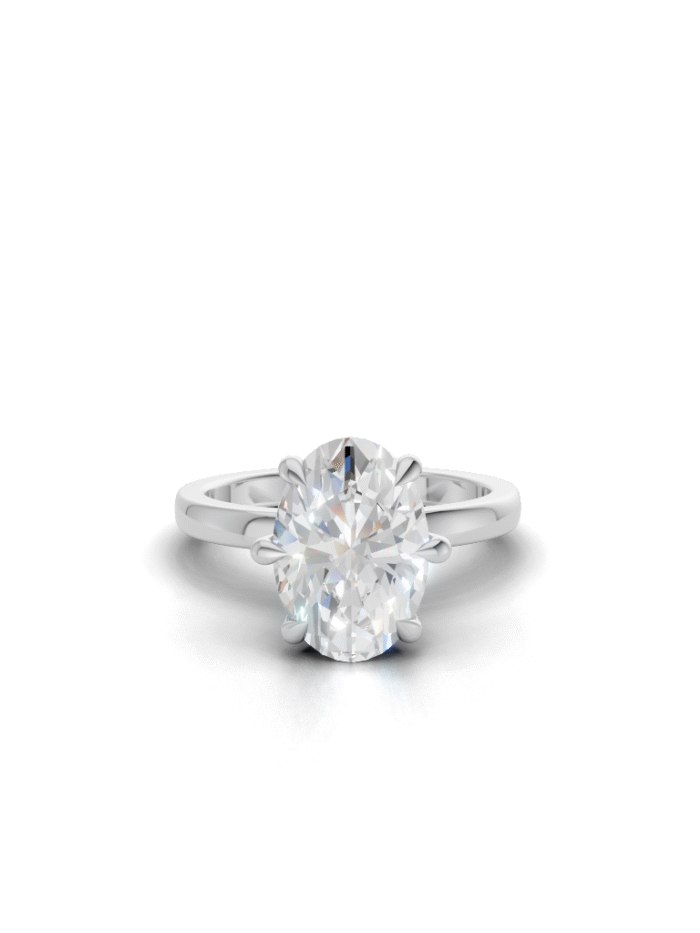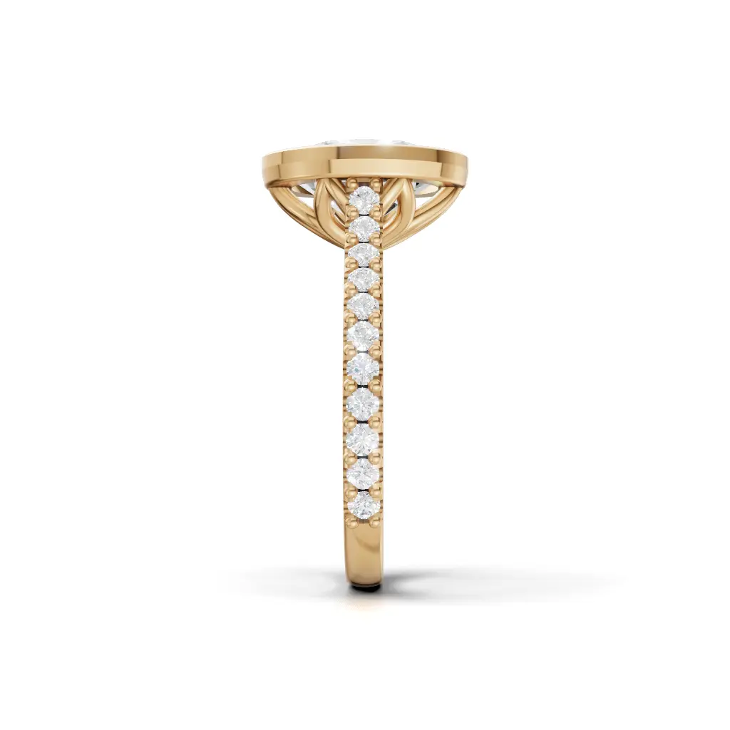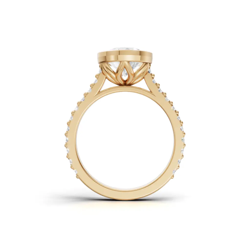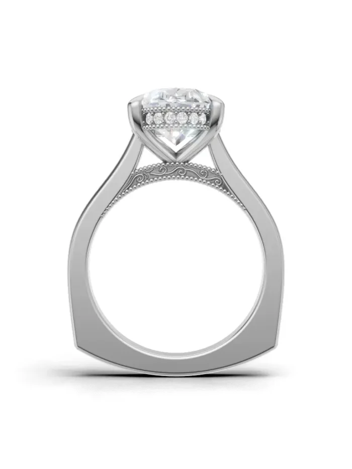 A regal ring with a tall, graceful profile lined with sparkling stones, giving it a true queen’s elegance from every angle.