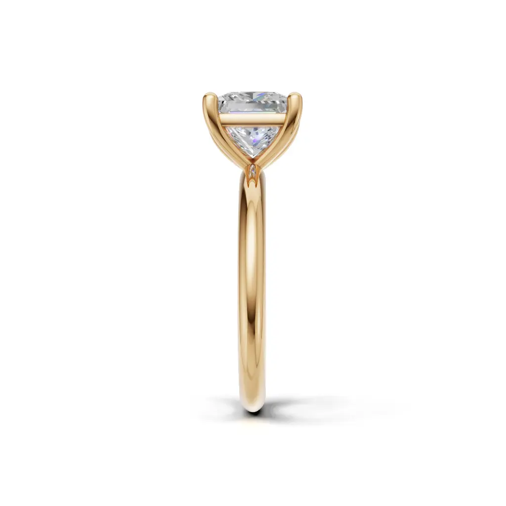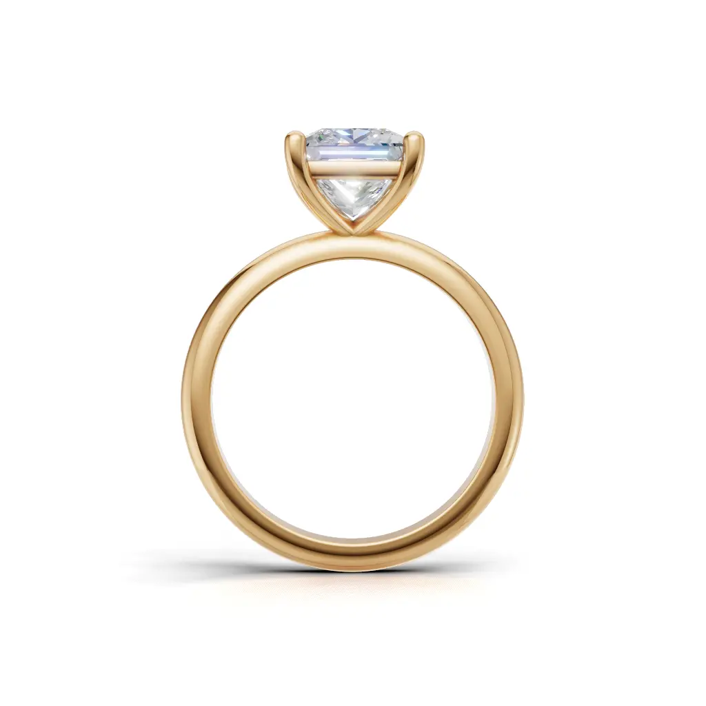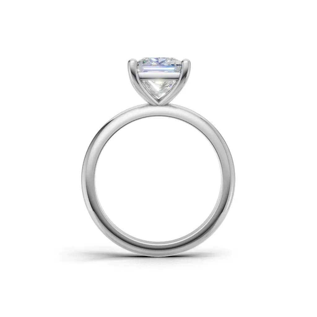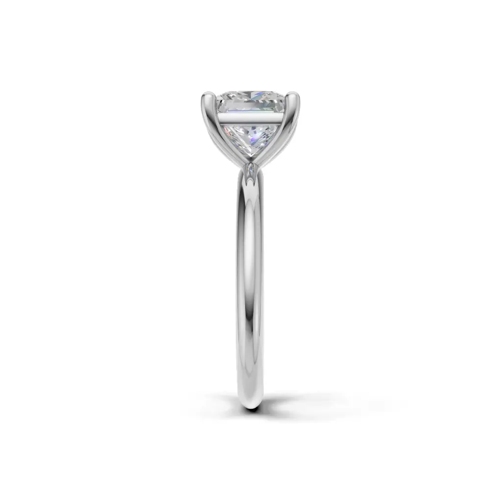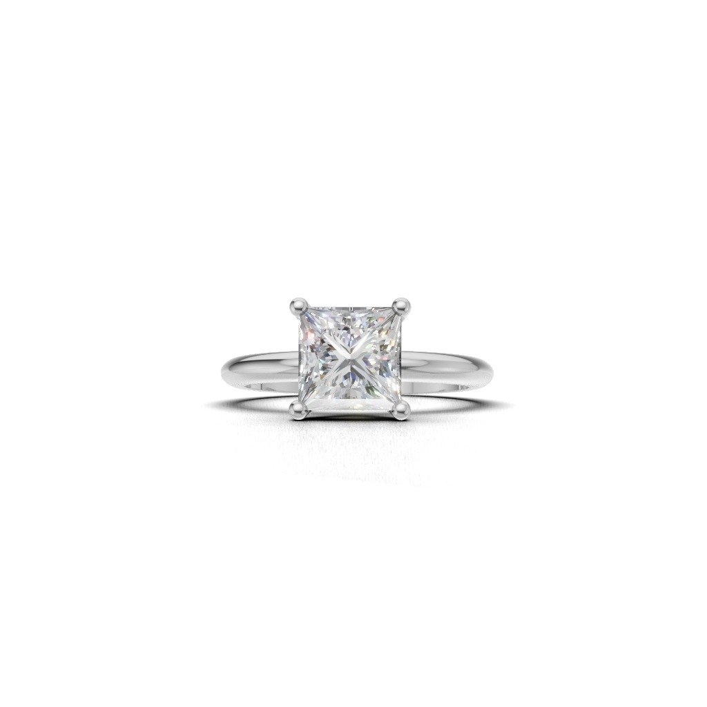 The setting uses four prongs to securely hold the stone, showcasing its brilliance. It’s a classic, elegant, and timeless design.