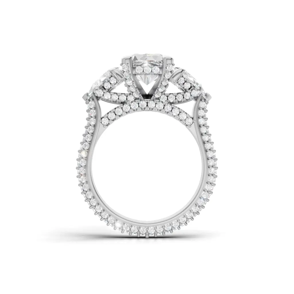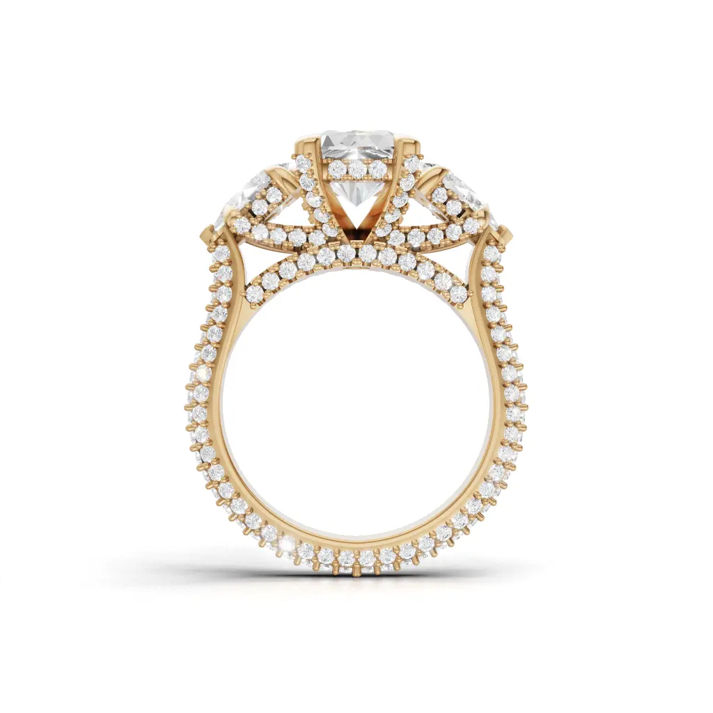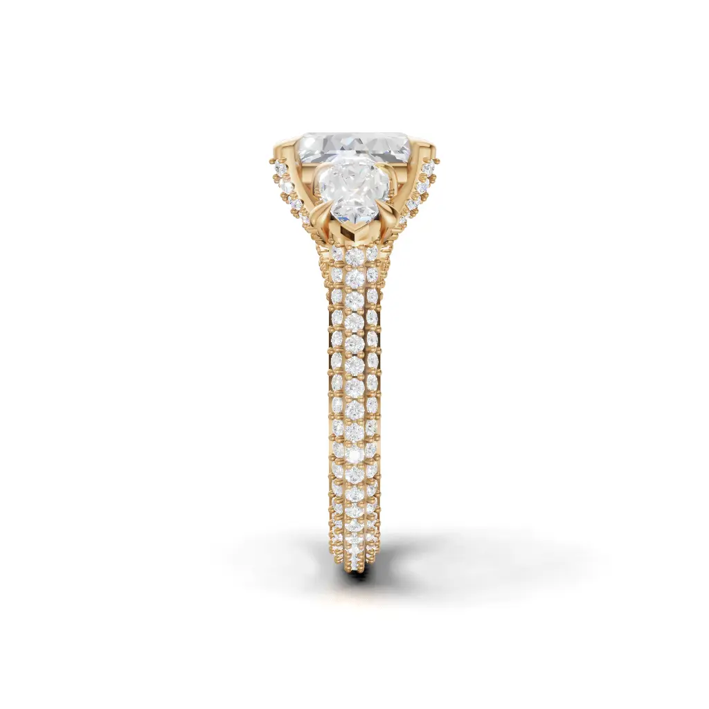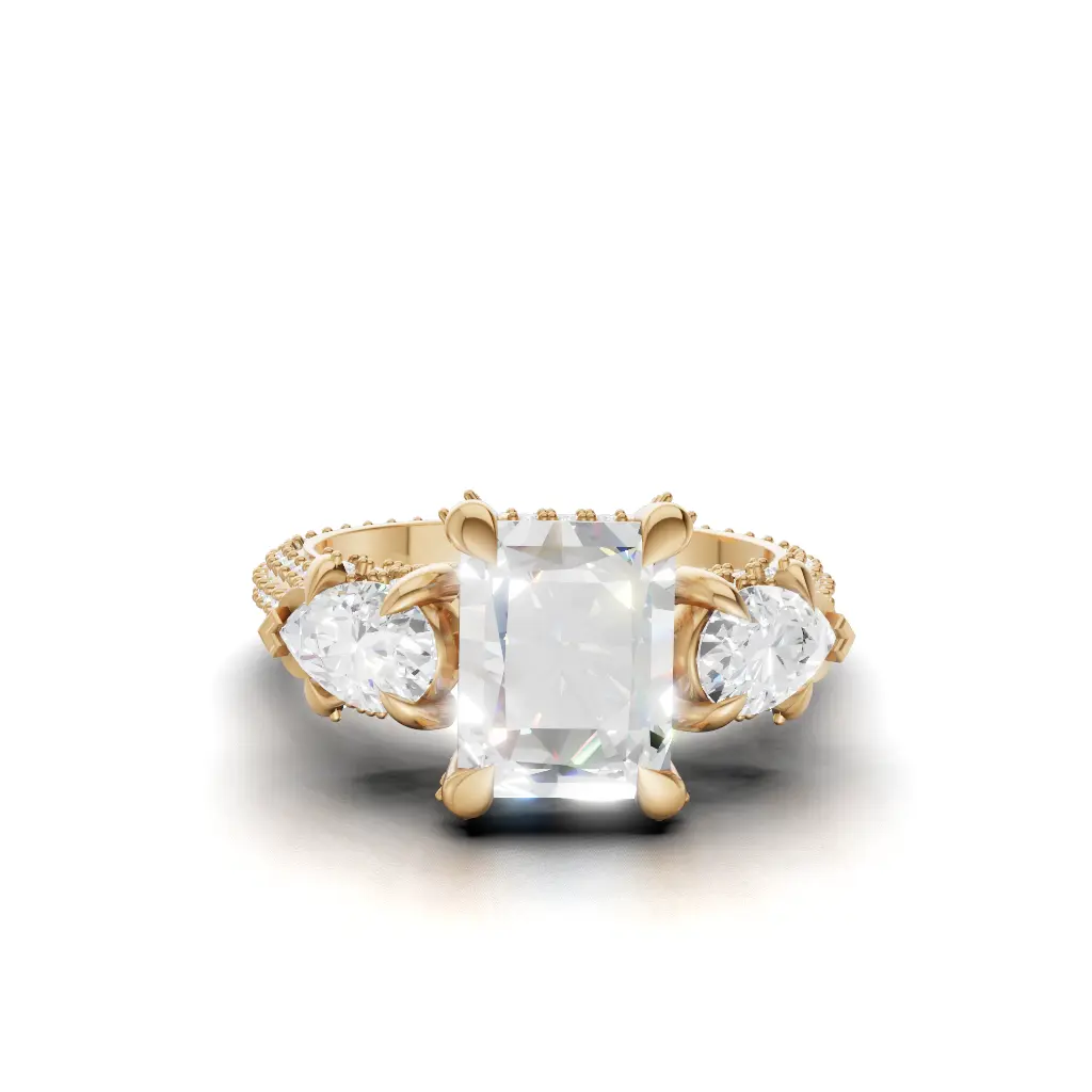 Celebrate your love with the Antique Laurette Three-Stone Engagement Ring by Merito Diamond. Crafted in elegant gold, it features three sparkling stones that symbolize past, present, and future. A timeless and luxurious design, perfect for a sophisticated proposal.