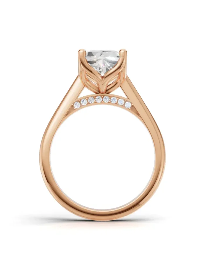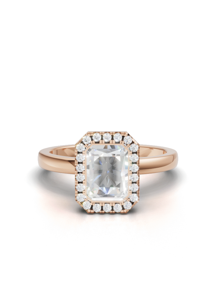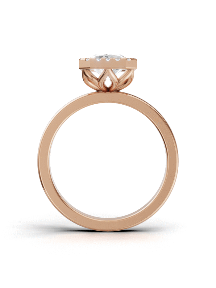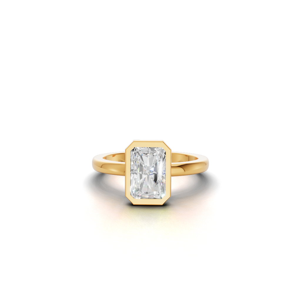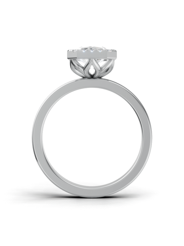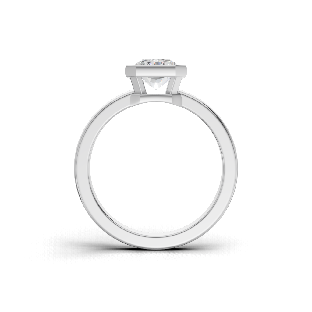 It Features a Round, Brilliant Diamond Completely Encircled By a Smooth, Polished Metal Rim. This Style Is Known For Its Contemporary, Minimalist Look And Offers Maximum Protection For The Center Stone. It’s a Chic And Highly Practical Choice.
