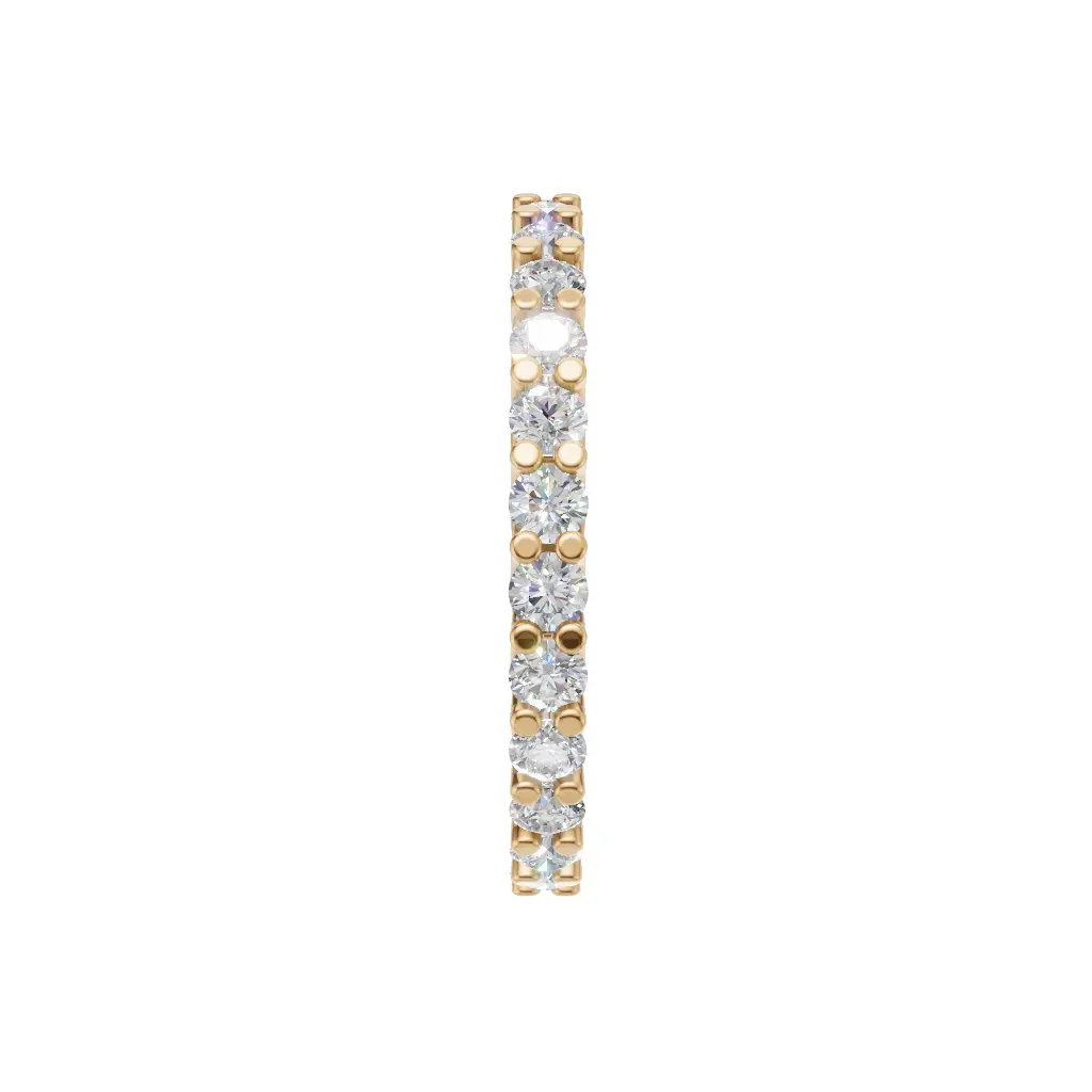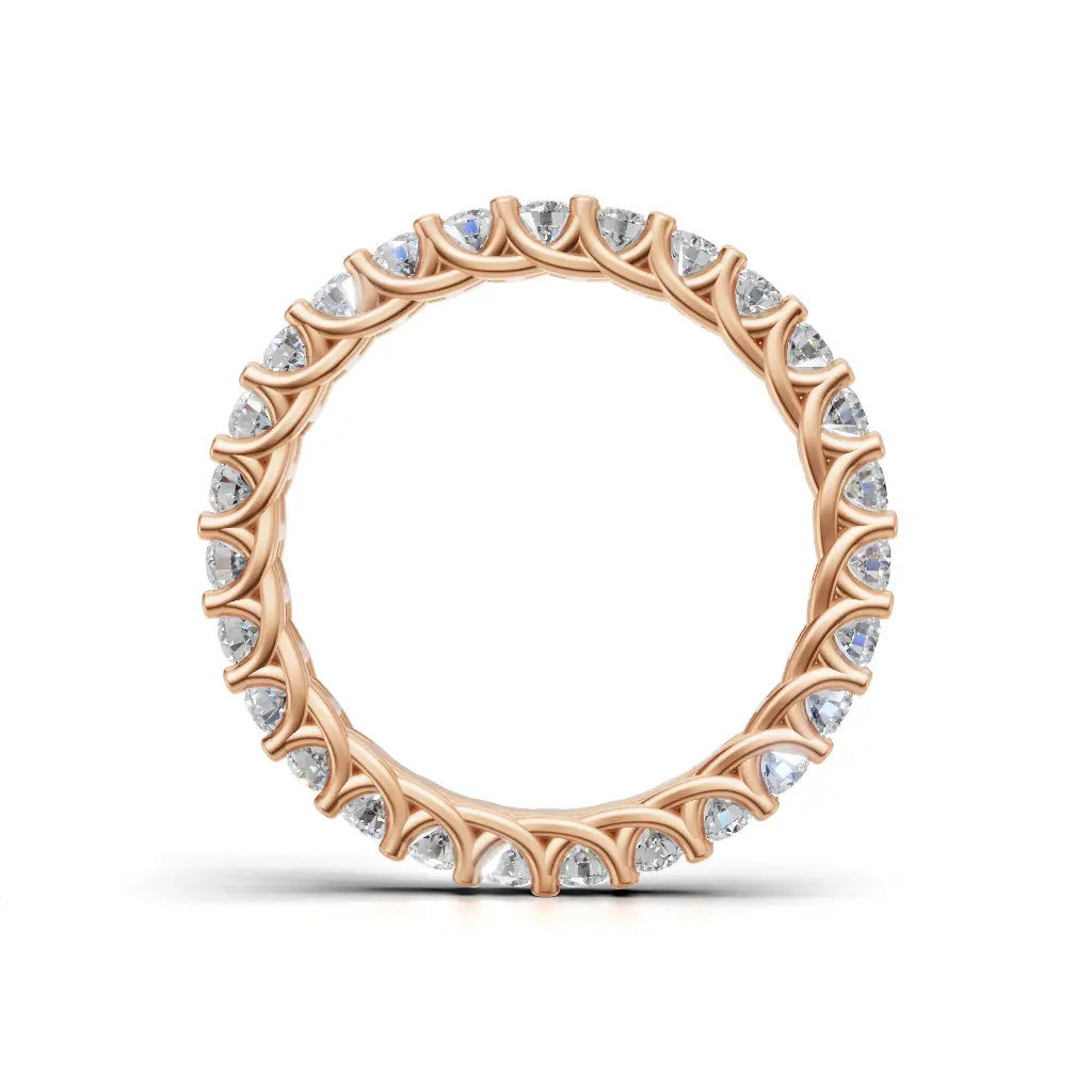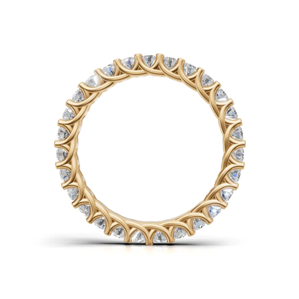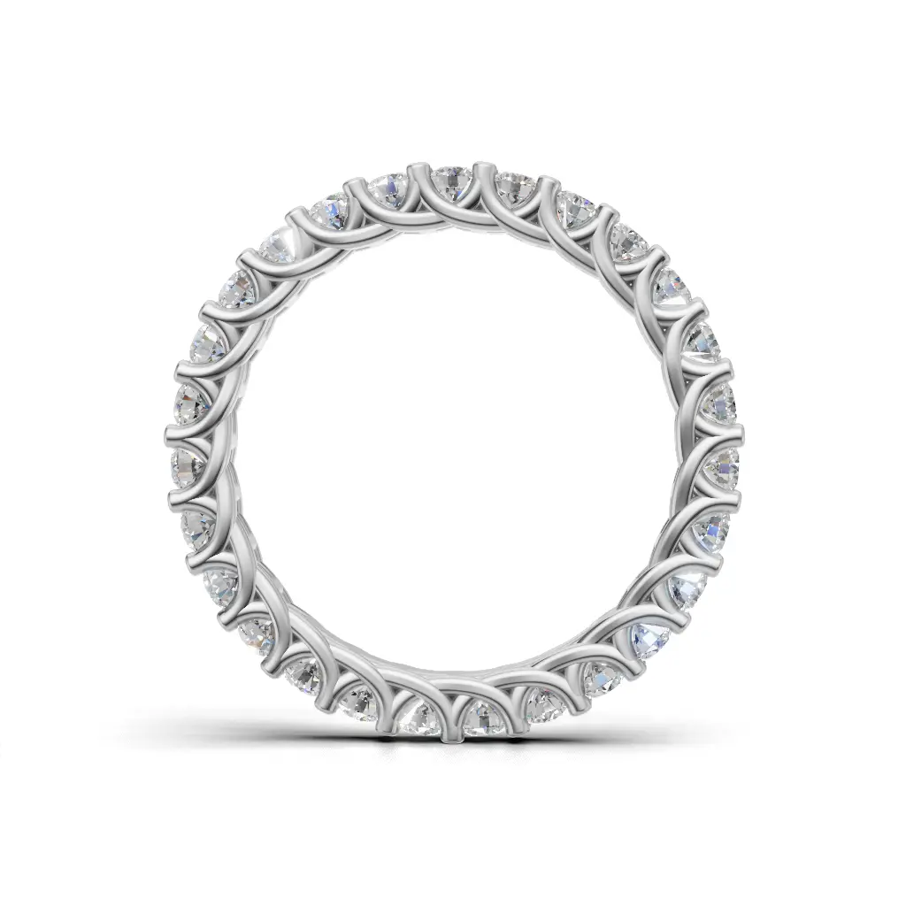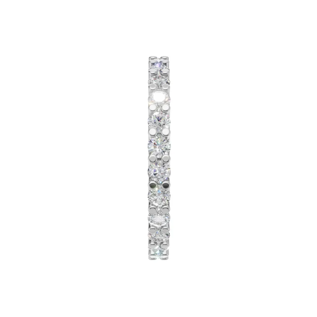A delicate diamond band with round stones set closely together, creating a bright, continuous sparkle that shines beautifully on the hand.