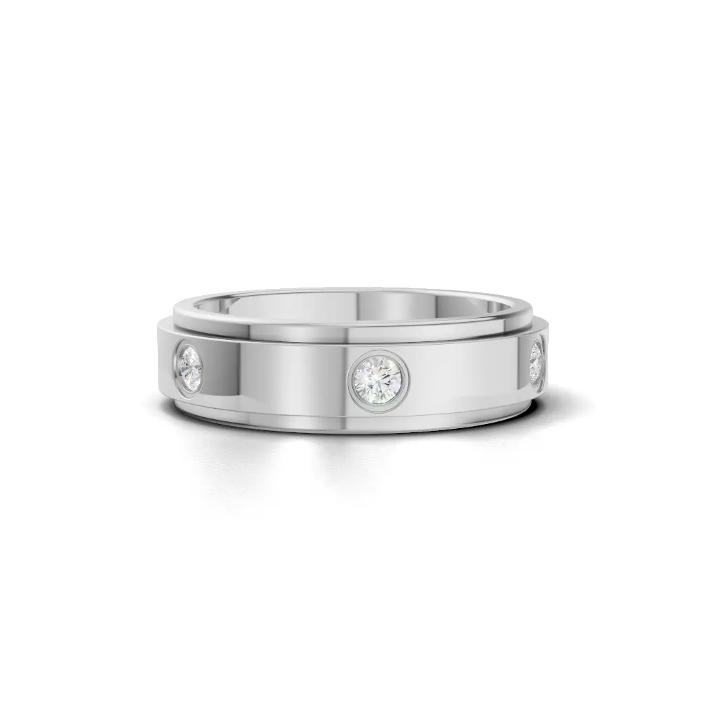 Simple, polished band featuring evenly spaced round diamonds set flush into the surface, creating a clean, minimal, and elegant look.