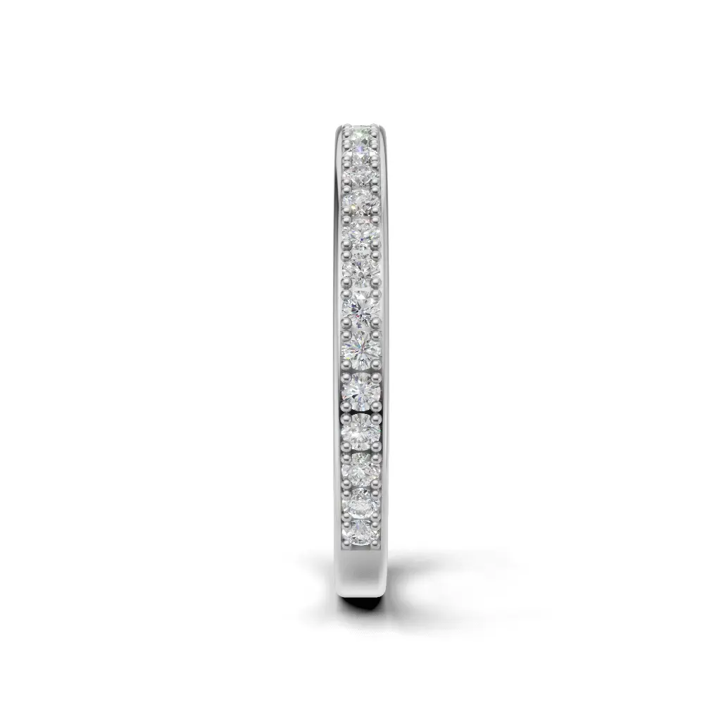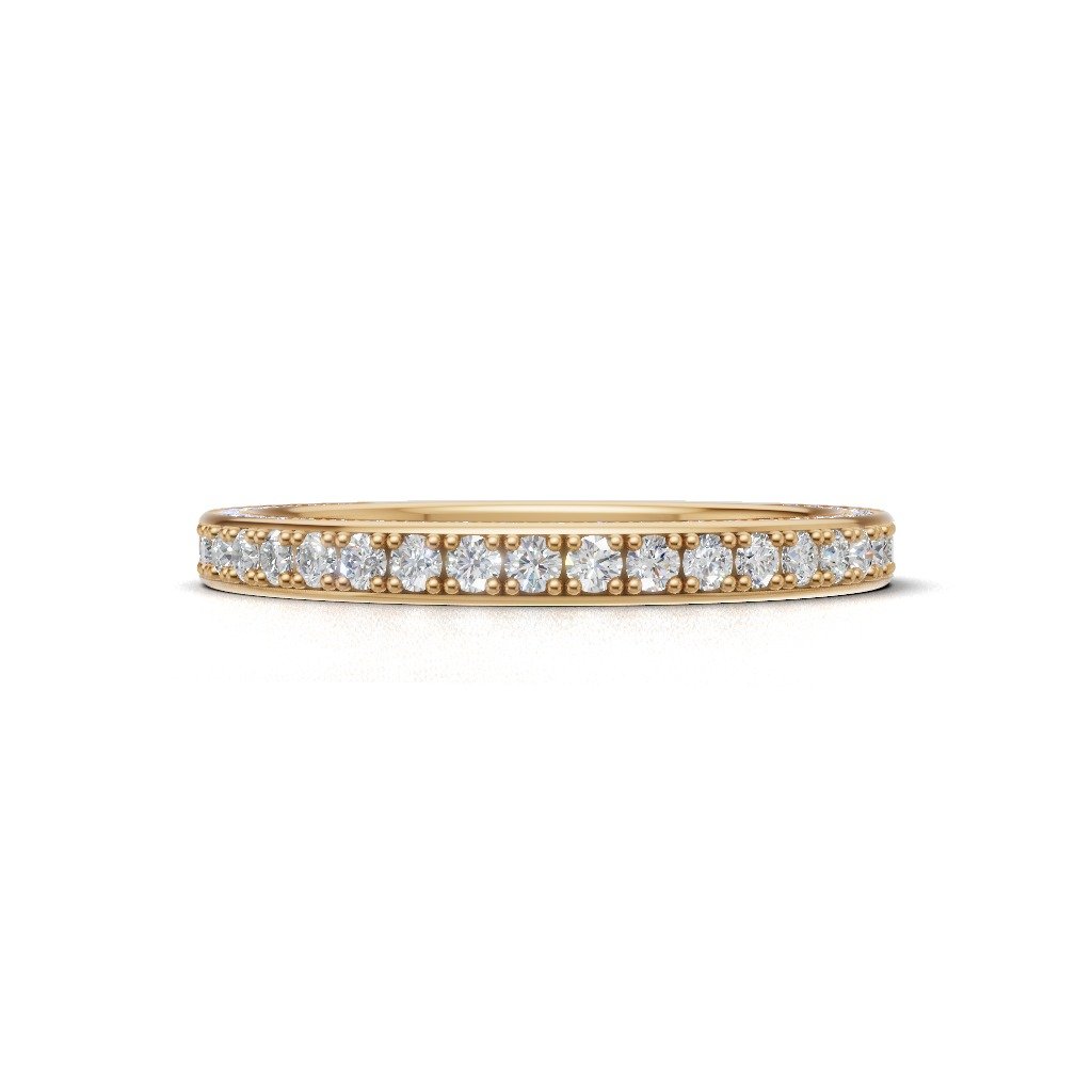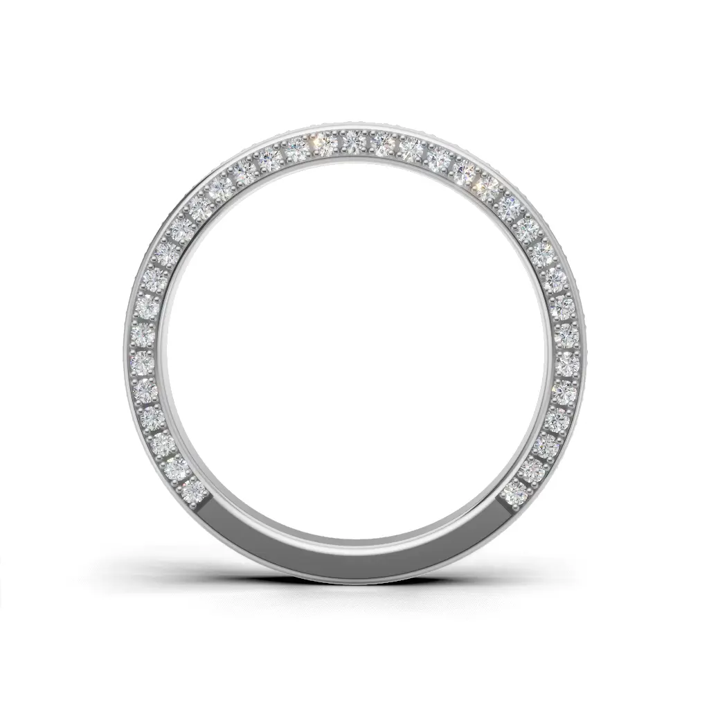 A slim circular band lined with brilliant diamonds that wrap all the way around, creating a continuous sparkle that looks elegant and radiant on the hand.